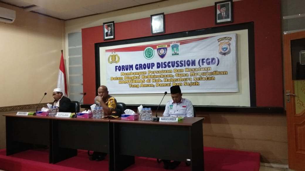 Dalam menjalin tali persaudaraan dalam ikatan persatuan antara Polri, Tokoh Agama, Tokoh Masyarakat, Tokoh Adat, MUI Kab. Halsel, dan Organisasi Mahasiswa Kab. Halsel, Polres Halsel gelar Forum Group Discussion (FGD) dengan Tema ” Membangun Persatuan dan Kesatuan Dalam Bingkai Ke Bhinekaan, Guna Mewujudkan Kamtibmas di Kab Halmahera Selatan, yang aman , Damai dan Sejuk.