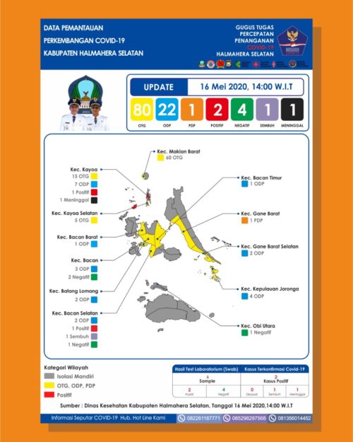 Kepada media cerminnusantara.co.id, Sabtu (16/05/20) Sekertaris Gugus Kabupaten Halmahera Selatan, Daud Djubedi menyampaikan bahwa Data pemantauan perkembangan (Covid-19) Kabupaten Halmahera selatan menunjukan bahwa Kecamatan Makian Barat sementara saat ini menunjukan jumlah OTG tertinggi yakni 60 orang.