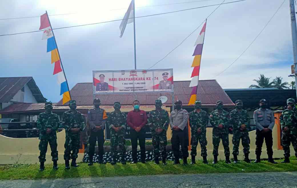 HALSEL, CN – Ucapan Selamat Hari Ulang Tahun (HUT) Bhayangkara Ke-74, Korps Tentara Nasional Indonesia (TNI) Angkatan Darat (AD) dalam hal ini Komando Rayon Mileter (KORAMIL) 1509-02 Kec. Obi, Kab. Halmahera Selatan (Halsel), Provinsi Maluku Utara (Malut). Sambut dengan penyerahan Tumpeng dan sosialisasi pencegahan Covid-19.(01/07/2020).