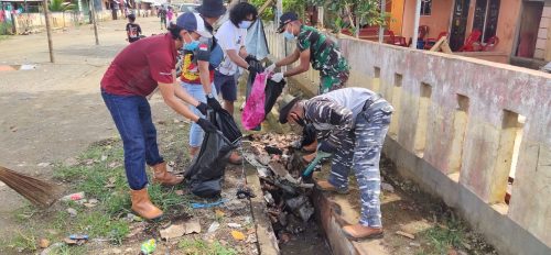 HALSEL, CN – Babinsa Serka Abu Kunio bersama Regu Pengamanan Obvit dan masyarakat sekitar berkerjasama dengan pihak Perusahaan Harita Grup melakukan Kerja Bakti Pembersihan Lingkungan Desa dalam rangka menanggulangi Wabah penyakit diare dan muntaber yang berapa hari merebak di Desa Kawasi Kecamatan Obi Kabupaten Halmahera Selatan (Halsel) Maluku Utara. Sekaligus memperingati Hari Sumpah Nasional Tahun 2021, Minggu (21/2/2021).