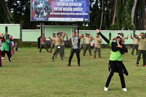 HALSEL, CN – Bertempat di Lapangan Makodim 1509/Labuha jalan Sapta Marga, Kampung Makian, Kecamatan Bacan Selatan, Kabupaten Halmahera Selatan (Halsel) Maluku Utara, Prajurit Kodim 1509 dan Ibu-ibu Persit KCK Cabang XXXVII melaksanakan olahraga bersama sebagai bentuk silahturahmi dan menjaga kondisi kesehatan ditengah Pandemi Covid 19, Jumat (26/2/2021).