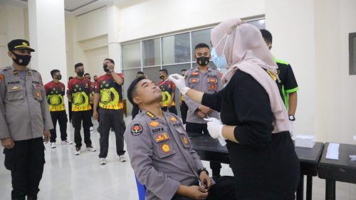 TERNATE, CN – Dalam rangka menjamin kesehatan personel pengamanan dan asistensi dalam rangka Pemungutan Suara Ulang (PSU) di Halmahera Utara (Halut) agar terbebas dari Covid-19, Polda Maluku Utara (Malut) pagi tadi menggelar Swab Antigen terhadap seluruh personel yang terlibat dalam BKO Pengamanan dan Tim Asistensi di 4 (Empat) Lokasi, 6 (Enam) TPS PSU Pilkada Halut, Jumat (23/4/2021).