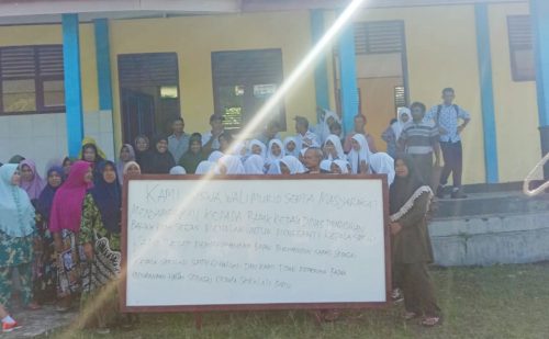 HALSEL, CN – Orang tua wali murid di Desa Silang Kecamatan Bacan Timur Selatan melakukan aksi penolakan didepan Gedung Sekolah Menengah Pertama Negeri 61 Kabupaten Halmahera Selatan (Halsel) Provinsi Maluku Utara (Malut) dengan adanya pergantian Kepala Sekolah.