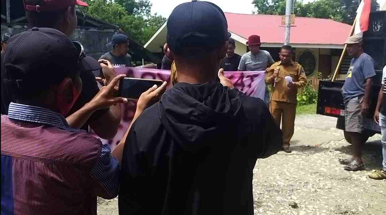 Masa aksi yang mengatasnamakan diri Aliansi Masyarakat Lingkar Tambang Obi Mayor (SIKAT-ATOM), turun jalan dan berorasi di depan Kantor Camat Kecamatan Obi.