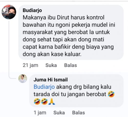 Sementara itu, di kolom komentar milik Akun Facebook Budiarjo, Netizen lainnya, Juma Hi Ismail dengan bercanda, mereka akan mengatakan bahwa jika uang tak punya jangan berobat.