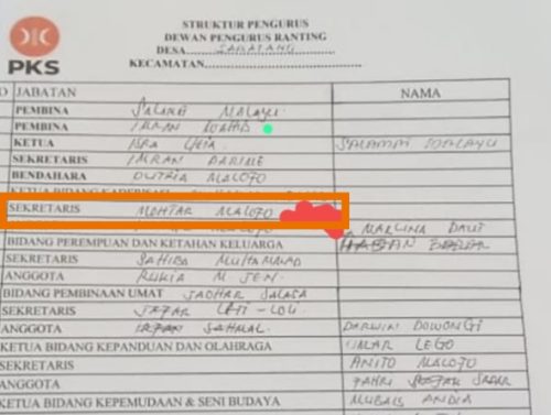 Dimana, nama Mohtar Malofo tercatat dalam Surat Keputusan (SK) Partai Keadilan Sejahtera (PKS) sebagai Sekertaris Dewan Pengurus Ranting Desa Sabatang.
