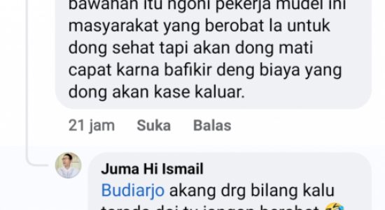 “Akan mereka bilang kalau uang tidak punya, itu jangan berobat,” tulis Akun Facebook Juma Hi Ismail.