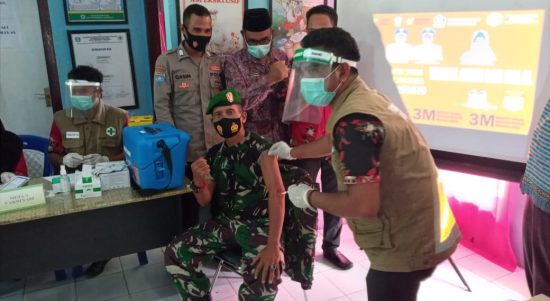 Danramil 1509-05/Kayoa disuntik Vaksin Covid-19, bersama Kepala Puskesmas Laromabati Fadli Thalib S.Kep dan tenaga Medis 20 orang, Sementara untuk tenaga medis yang belum divaksinasi akan dilakukan esok hari. (Red/CN)