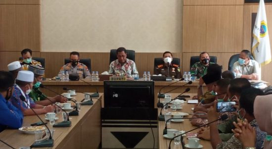 Kapolres Halteng, AKBP Nico Andreano Setiawan, S.I.K., M.M. dengan Bupati Halteng dan Dandim Weda serta Forkopimda Halteng, Tokoh agama dan masyarakat melaksanakan Rapat dalam rangka menyikapi kasus pembunuhan 3 (Tiga) warga Patani di hutan Halmahera.
